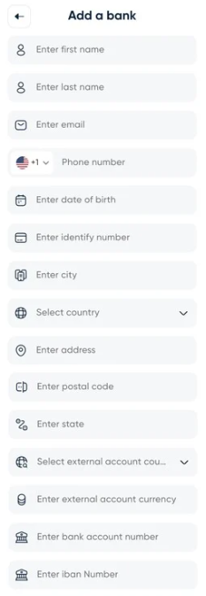 Enter external account currency - USD, $, Dollars